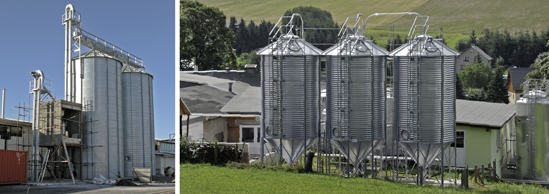 Stahlsilos zur Innen- und Außenaufstellung, für pneumatische und mechanische Befüllung.